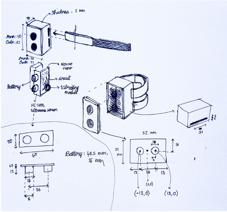 The design incorporates all the technology required for the function of any white cane as a ”Smart-cane”. It has slots through which the velcro belt can pass through and can be fastened to any ordinary smart cane. The enclosure houses sensor, microcontroller, vibration motor and the battery.